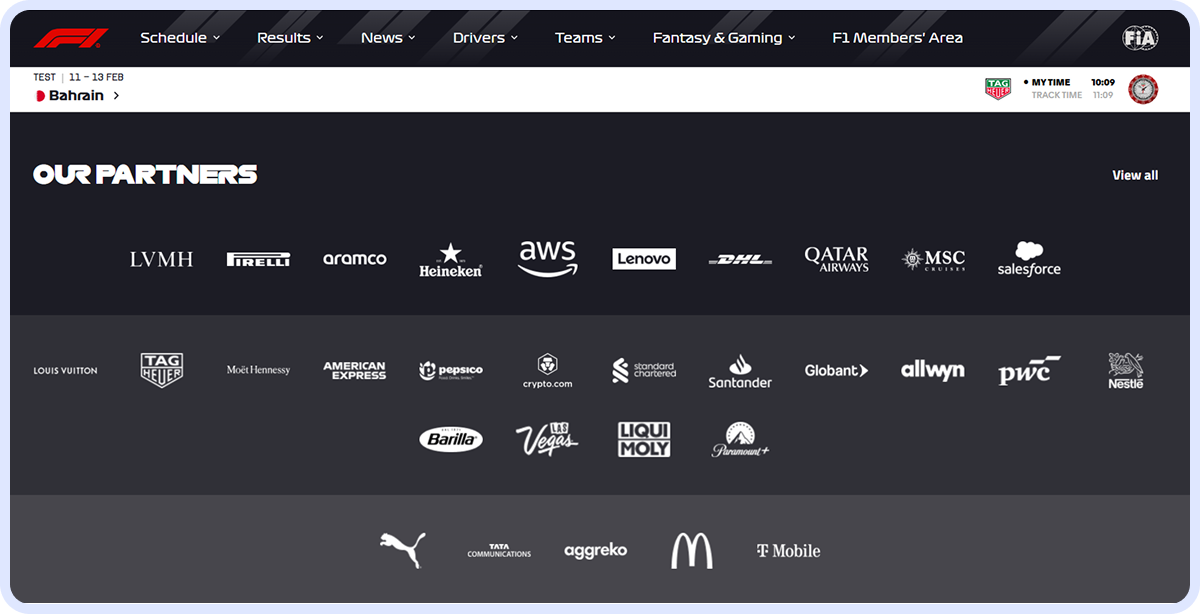 Just take a look at the Formula 1 sponsor block on their website. There are many e-commerce brands, from Lenovo, Puma, and Louis Vuitton to American Express and Nestle. Each logo is clickable, with a link to the sponsor’s website.Formula 1 "Our Partners" sponsor page displaying logos of major brands including LVMH, AWS, Heineken, Lenovo, and others